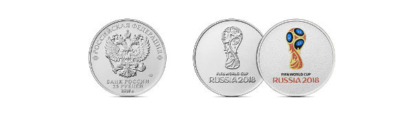 У 25-рублевой монеты из недрагоценных металлов в обычном исполнении на обороте имеется рельефное изображение официальной эмблемы Чемпионата мира по футболу FIFA 2018 года. Та же эмблема, но выполненная в цвете, расположена на обороте монеты в специальном исполнении.