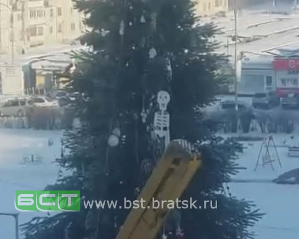 На кадрах, опубликованных местным жителем, запечатлено, как рабочие при помощи подъёмного крана навешивают на ёлку игрушки. Шары, гирлянды, звезду, снежинки и... скелет. Причем, внушительных размеров.