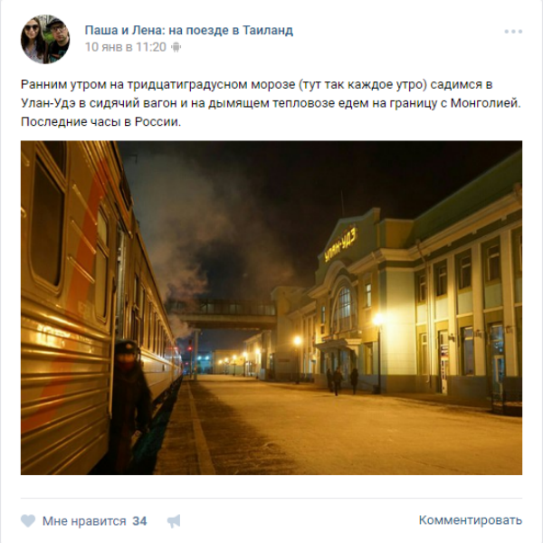 В Улан-Удэ неделю назад побывали путешественники и блогеры Павел Котиков и Елена Гитт. 5 января пара отправилась из Москвы в длинное путешествие на поезде в Таиланд.