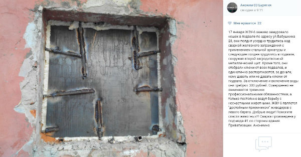 - 17 января ЖЭУ-6 заживо замуровало кошек в подвале по адресу ул. Бабушкина 23, они полдня усердно трудились над сваркой железного заграждения с применением стальной арматуры и следующие полдня трудились в подвале, сооружая второй загродительный металлический щит. Кроме того, они отобрали ключи от всех подвалов, и единолично распоряжаются, за деньги, кому давать или не давать ключи от подвала. За отключение и включение воды они требуют 300 рублей. Совершенно не занимаются прямыми профессиональными обязанностями, а только постоянно ведут борьбу с несчастными животными. ЖЭУ-6 является «достойным приемником» живодеров с Левого берега. Добрые люди! Помогите спасти животных! Сварка произведена у подъезда #1 со стороны здания Приватизации, - написал он в группе «Аноним 03 Бурятия» (орфография сохранена).