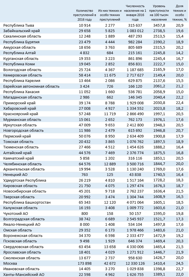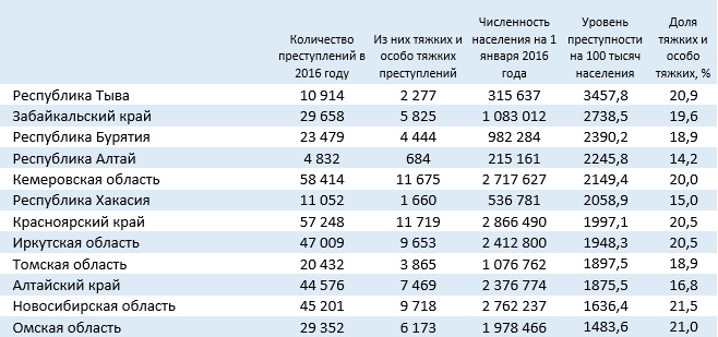 Рейтинг составлен «Байкал-Daily» по данным Росстата о численности населения регионов России на 1 января 2016 года, единой межведомственной информационно-статистической системы об общем количестве преступлений и числе тяжких и особо тяжких преступлений, зарегистрированных в январе-декабре 2016 года.