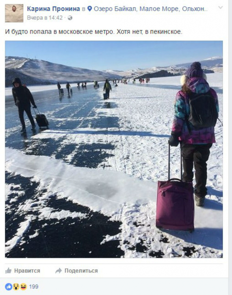 Позже автор фото пояснила – на фото изображён пролив между Ольхоном и Большой землёй. Пересекать его должны люди на специальных «хивусах» - суднах на воздушной подушке.