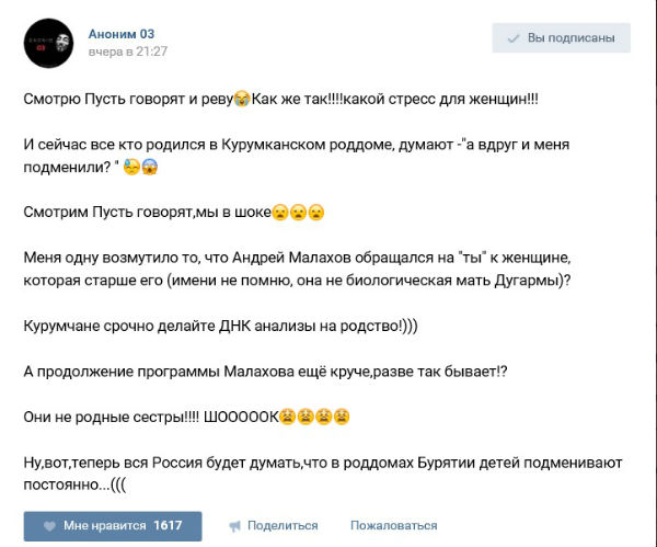 Напомним, на шоу рассказывалось, как 21 января 1983 года в Курумканском роддоме у однофамилиц Цыреновых Алисы и Людмилы подменили дочерей. Ничего не подозревающие женщины 34 года воспитывали неродных детей. Этой историей заинтересовался Первый канал, 6 февраля в эфир вышла первая часть программы «Пусть говорят».