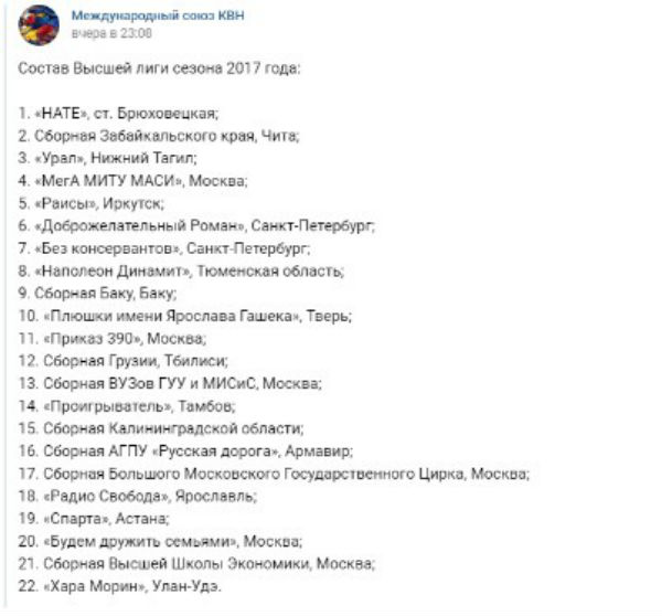 Вчера, 12 февраля вышла в эфир телеверсия сочинского фестиваля «КиВиН-2017». По его итогам стало известно, какие из молодых команд достойны пройти в Высшую лигу в новом сезоне. Как сообщал «Байкал-Daily», Бурятию представляли две команды - сборная «Хара Морин» и женская команда БГУ «Без разницы».Ещё в конце января стало известно, что первая команда пробилась в Высшую лигу КВН, а вторая не прошла во второй тур и не была показана в телеверсии.