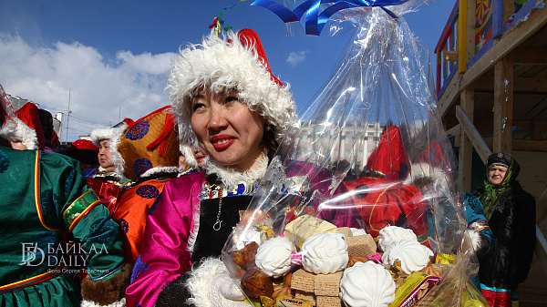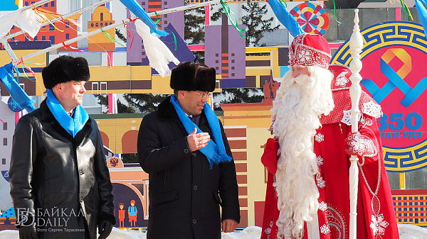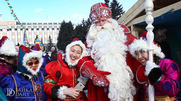 Следующим поздравляющим стал Дед Мороз из Великого Устюга, отметивший то, какая солнечная республика – Бурятия. «Но солнечная она в первую очередь из-за людей», сказал волшебник. Не обошёл вниманием сказочный герой и утренний снегопад, признавшись, что это «их с Сагаан Убгэном рук дело».