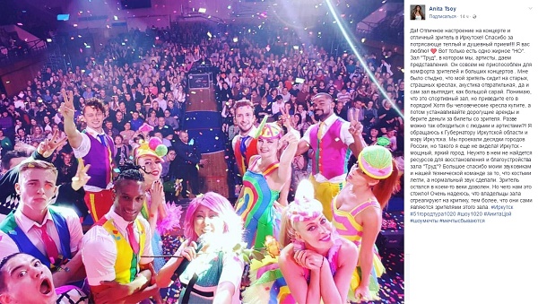 После выступления в Иркутске в ДК «Труд» Анита Цой написала на своих официальных страничках в соцсетях, что на концерте настроение и зрители были отличные.
