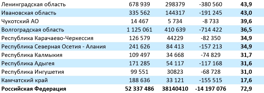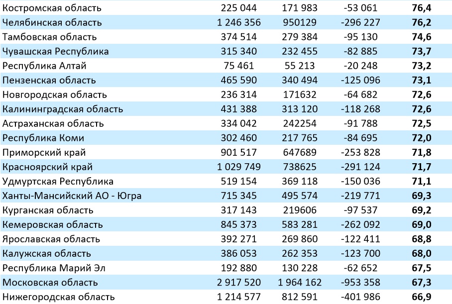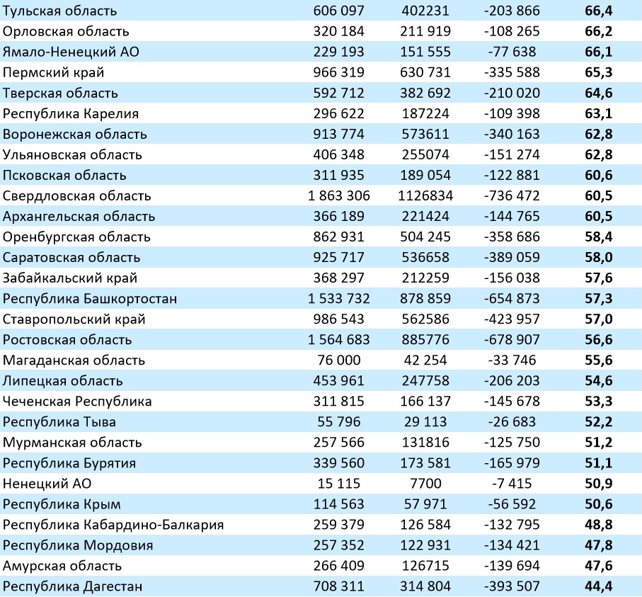 А вот в разрезе по Сибири Бурятия занимает последнее место в рейтинге после Тывы (52,2%) и Забайкальского края (57,6%).