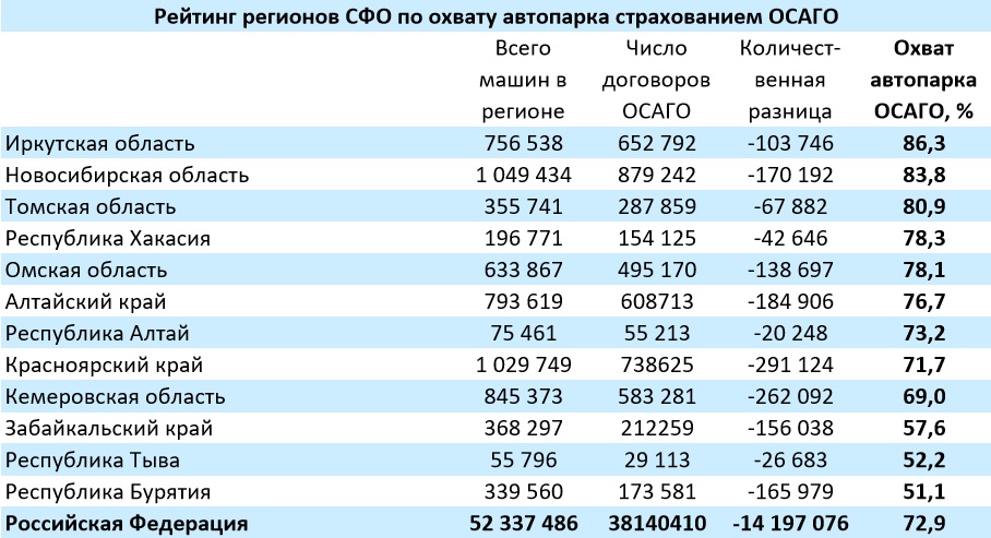 «Байкал-Daily» составил рейтинг по охвату автопарка регионов страхованием ОСАГО.