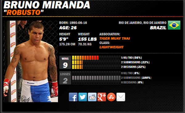 Его соперник Бруно Миранда, известный как Робусто, считается серьёзным соперником. Робусто родился в городе Рио-де-Жанейро, Бразилия. Теперь принадлежит к известному тайландскому клубу «Tiger MMA». Его результат на профессиональном ринге - 9 побед и 2 поражения.