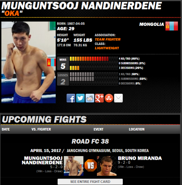 В Южной Корее за 1 миллион долларов поборются монгольский боец Мөнгөнцоожийн Нандин-Эрдэнэ, больше известный как Ока, и его соперник из Бразилии Бруно Миранда, сообщает АРД.