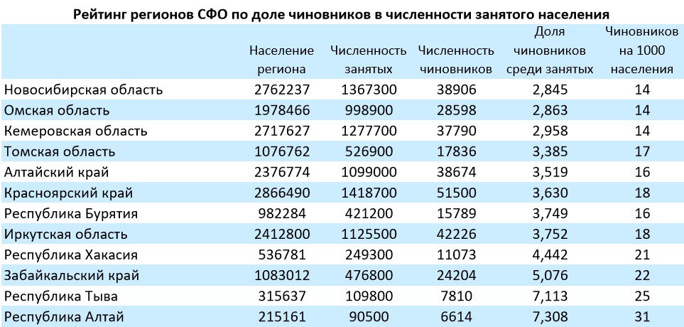 В числе сибирских аутсайдеров - республика Алтай, где 7,3% занятых в экономике - чиновники, Забайкальский край (5%) и республика Тыва (7,1%).