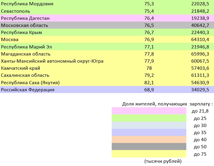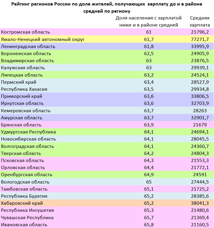 В целом по России 68,9% работников получает заработную плату до и чуть выше средней.