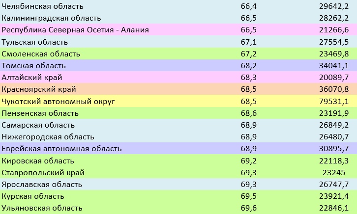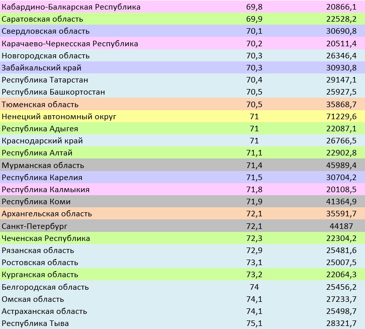 Отметим, что в хвосте рейтинга находятся все лидеры по размеру средней зарплаты – Москва, Магаданская область, Ханты-Мансийский автономный округ, Камчатский край, Сахалинская область, и Якутия. Отсюда можно сделать вывод, что складывается она за счёт того, что единицы получают очень высокие зарплаты.