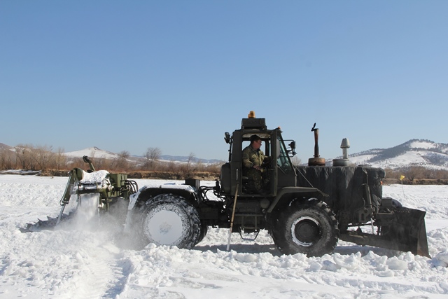 Накануне работы по распиловке льда проводились в районе села Вознесеновка Тарбагатайского района. Это один из пяти затороопасных участков Бурятии. С помощью полковых землеройных машин на каждом участке делаются по три-четыре пропила, протяжённость каждого в длину составляет 3-4,5 километра. Проверено, что во время ледохода вода уходит в эти углубления, что ослабляет прочность льда и не допускает ледовые заторы.