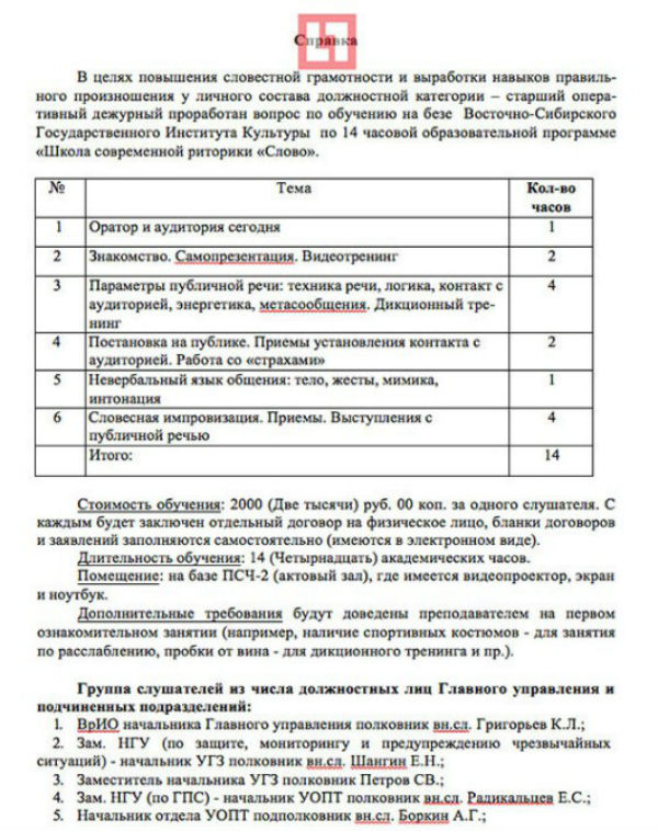23 бурятским спасателям, в том числе начальнику республиканского главка МЧС Константину Григорьеву и его заместителям, придётся пройти 14-часовые курсы риторики. Исправлять свою речь сотрудникам МЧС придётся из-за ошибок и неточностей произношения во время докладов на межрегиональных совещаниях, сообщает Лайф со ссылкой на источник.