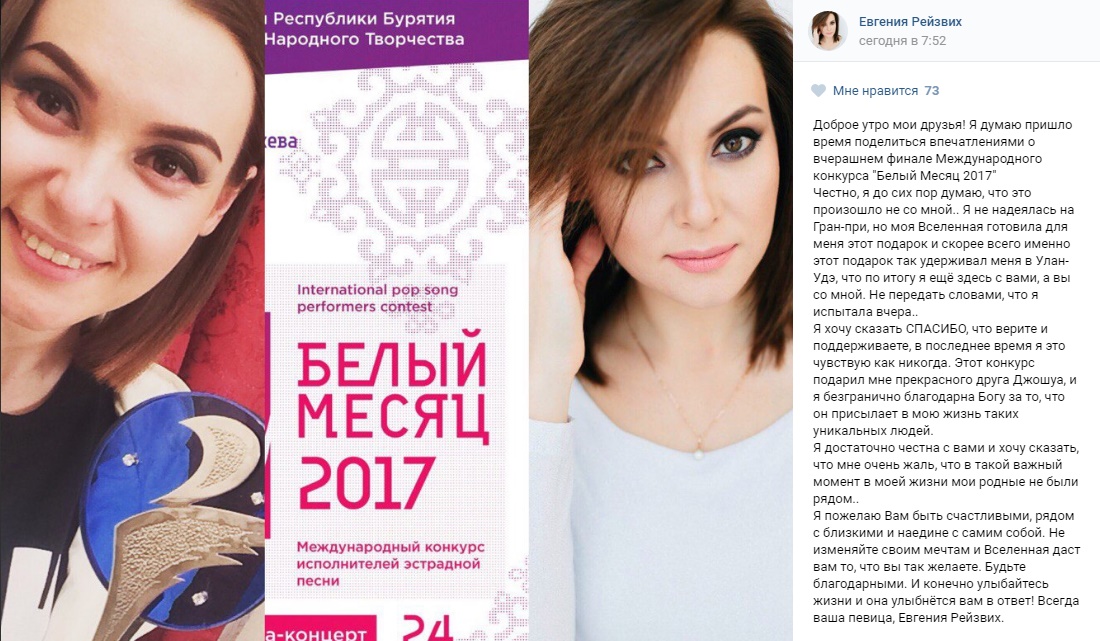 - Честно, я до сих пор думаю, что это произошло не со мной.. Я не надеялась на Гран-при, но моя Вселенная готовила для меня этот подарок и скорее всего именно этот подарок так удерживал меня в Улан-Удэ, что по итогу я ещё здесь с вами, а вы со мной. Не передать словами, что я испытала вчера..