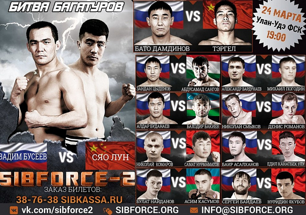 Их соперниками выступят бойцы из Иркутска, Красноярска, Узбекистана, Азербайджана, Киргизии, Таджикистана. Изюминкой турнира станет то, что «Sibforce-2» - это первый турнир в Восточной Сибири, в котором примут участие китайские бойцы. Также это первый профессиональный турнир по ММА в Улан-Удэ.