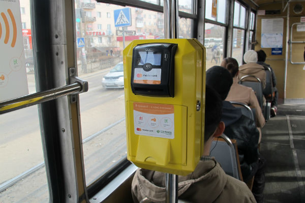 Установлены они в центральной части вагона. При входе в трамвай, если вы оплачиваете банковской картой с чипом, её нужно вставить в терминал, при этом введение пин-кода не требуется.