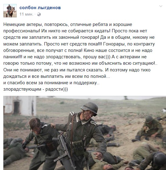 «Немецкие актеры, повторюсь, отличные ребята и хорошие профессионалы! Их никто не собирается кидать! Просто пока нет средств заплатить их законный гонорар! Да и в общем, никому не можем заплатить. Просто нет средств пока!!! Гонорары, по контракту обговоренные, все получат сполна! Кино наше состоится, и не надо паники! И не надо злорадствовать, прошу вас. А с актерами не говорю только потому, что не возможно им объяснить всю ситуацию! Они не понимают, не раз им пытался сказать. И поэтому надо тихо дождаться и все выплатить им всем по полной».
