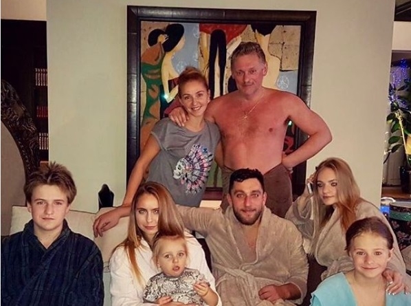 На снимке запечатлены дети обоих супругов — Николай, Елизавета, Мик и Дени Песковы, а также Александра Жулина и общая дочь Татьяны и Дмитрия, маленькая Надя. Все младшие члены семьи позируют в махровых халатах, сама Татьяна облачена в простую футболку, а Дмитрий решился предстать полуобнаженным.