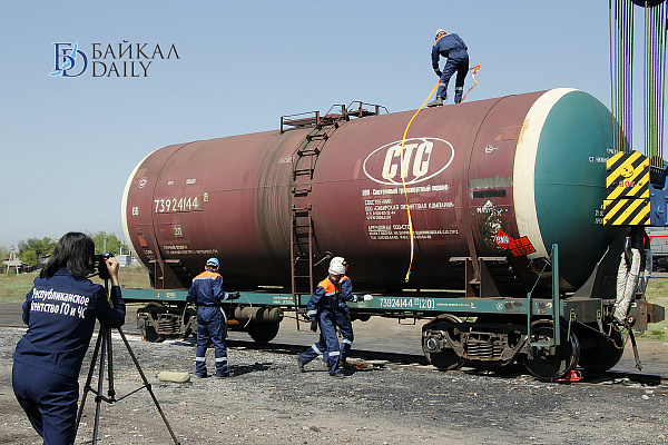 По условному сценарию произошёл сход 6 вагонов, из которых две цистерны с нефтепродуктами разгерметизировались и разлились на месте аварии с вытеканием на акваторию Селенги.