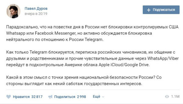 «Парадоксально, что на повестке дня в России нет блокировки контролируемых США WhatsApp или Facebook Messenger, но активно обсуждается блокировка нейтрального по отношению к России Telegram. Как только Telegram блокируется, переписка российских чиновников, их общение с друзьями и родственниками и прочие чувствительные данные через WhatsApp/Viber перейдут в подконтрольные Америке облака Apple iCloud/Google Drive», - написал Дуров на своей странице в социальной сети «ВКонтакте».