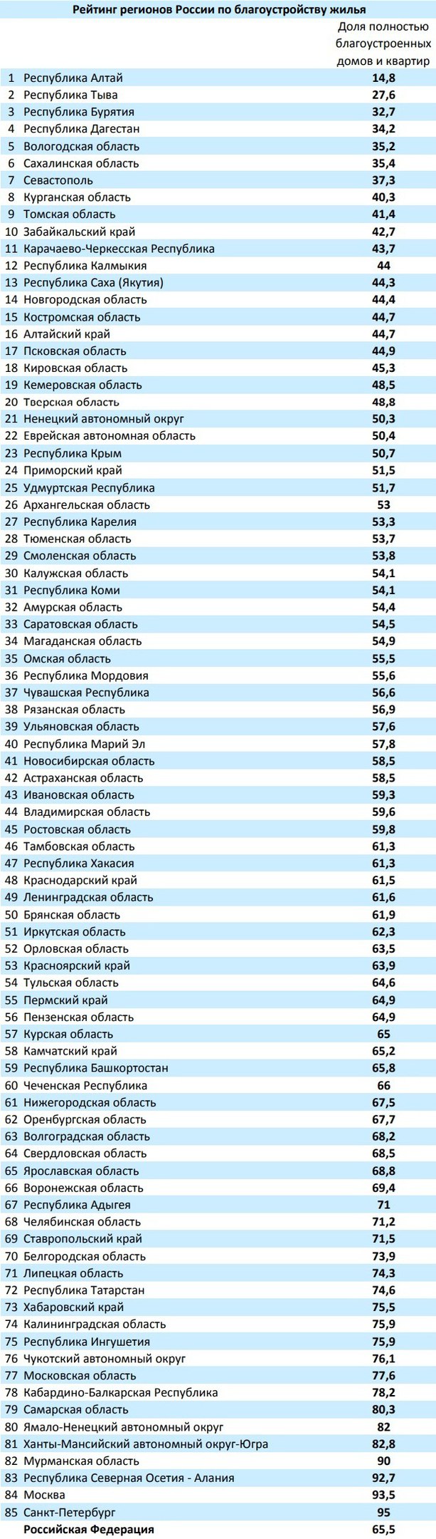 Самый худший результат показала республика Алтай, где всего 14,8% жилищного фонда обеспечено всеми видами благоустройства. На втором месте – Тыва (27,6%), на третьем – Бурятия (32,7%).