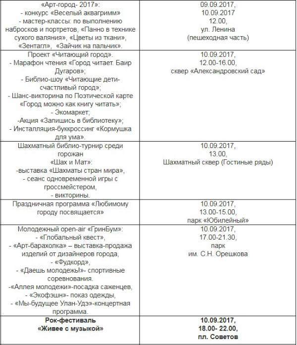 Празднование Дня города продолжится и сегодня. В течение дня будут проходить различные мероприятия в центре Улан-Удэ, парках «Юбилейный» и им. Орешкова. В 18 часов на площади Советов стартует рок-фестиваль «Живее с музыкой». Во время него пауэрлифтер Оксана Кошелева планирует установить новый рекорд. Одна из сильнейших женщин России попробует руками удержать два мотоцикла, которые будут газовать в разные стороны.