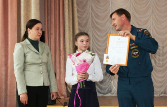 На награждение в школу пришли сотрудники МЧС. Заместитель начальника ГУ МЧС России по Иркутской области Виктор Пашков вручил школьнице цветы и медаль.