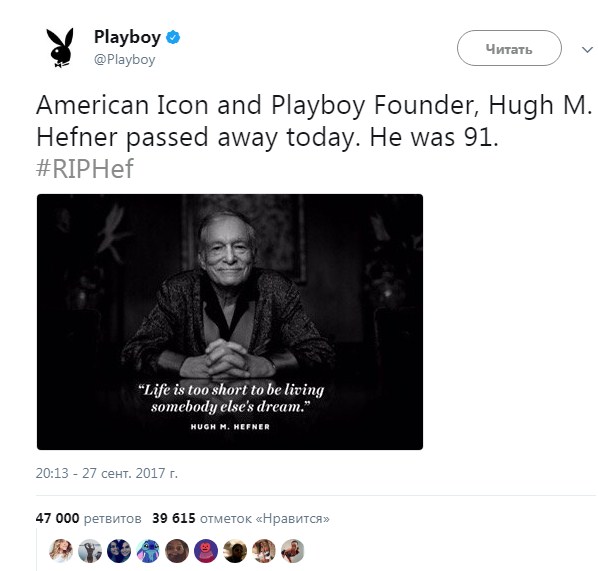 «Культовая фигура Америки и основатель Playboy Хью М. Хефнер ушёл из жизни сегодня. Ему был 91 год», — говорится в сообщении.