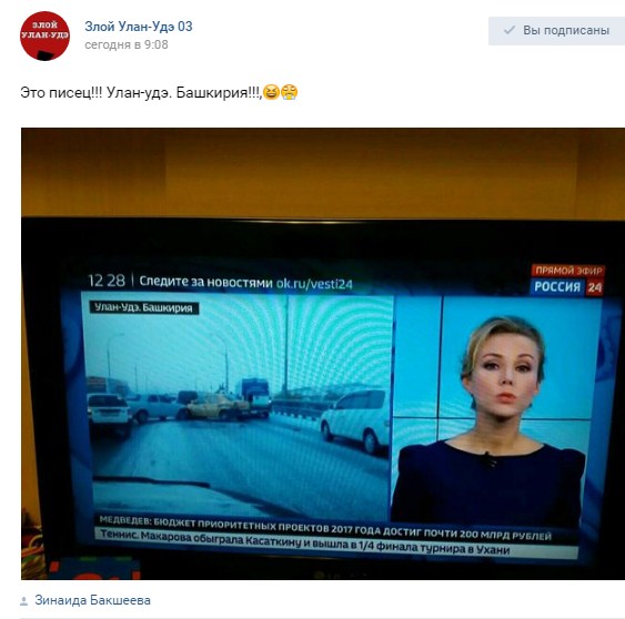 В прямом эфире телеканала «России 24» была допущена ошибка, связанная с названием Бурятии. Накануне телеканал рассказывал о вчерашнем коллапсе в связи со столкновением 13 машин на мосту «Бегущая лань» в Улан-Удэ. В это время в верхнем угле красовалась надпись «Улан-Удэ, Башкирия».