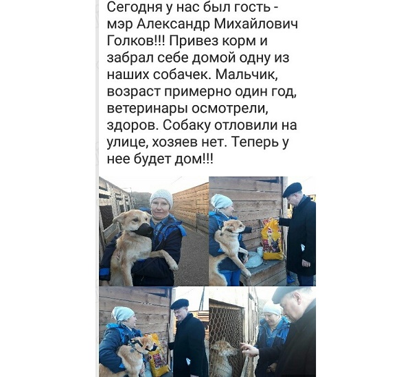 - Сегодня у нас был гость – мэр Александр Михайлович Голков!!! Привёз корм и забрал себе домой одну из наших собачек. Мальчик, возраст примерно один год, ветеринары осмотрели, здоров. Собаку отловили на улице, хозяев нет. Теперь у неё будет дом!!! – написала у себя на странице в соцсетях специалист по уходу за собаками Комбината по благоустройству Ольга Зубакина.