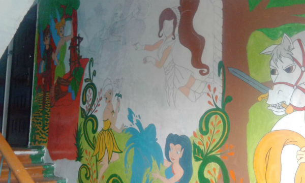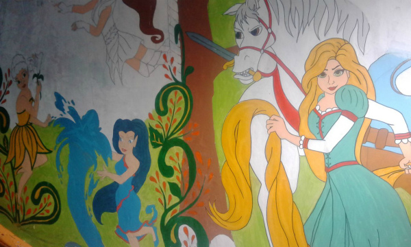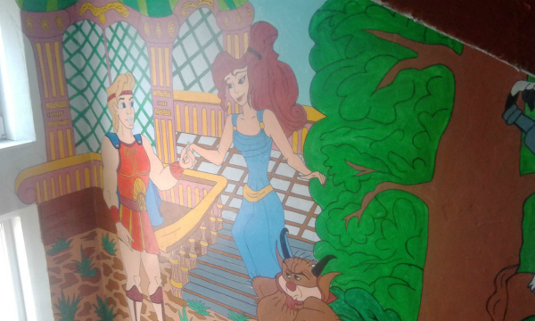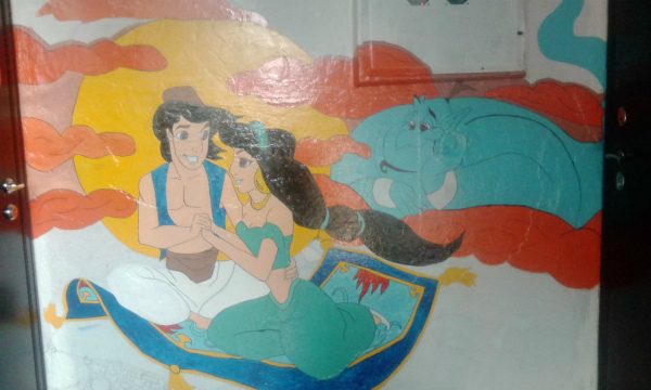 На стенах подъезда изображены герои таких диснеевских мультфильмов, как «Алладин», «Русалочка Ариэль», «Рапунцель» и многие другие. Стоит отметить, что роспись выполнена в ярких тонах, от потолка до пола. Также разрисованными оказались и электрощитки.
