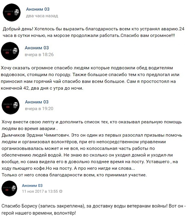 - Огромное спасибо тем, кто устранял аварию! Ребята, спасибо за канализацию, спасибо за воду! Удачи Вам и чтобы зима прошла у нас всех без отключений и ЧС!