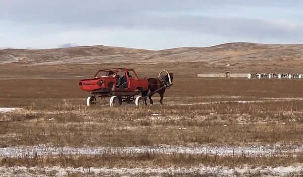 Жители Бурятии стали свидетелями курьёзного случая в Джидинском районе. В Петропавловке местные жители умудрились запрячь лошадь в то, что осталось от старого «Запорожца».