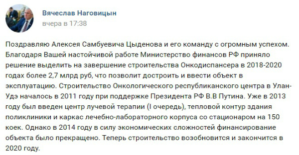 Минфин России выделил на строительство онкодиспансера в Бурятии 2,7 миллиарда рублей. Об этом сообщил экс-глава Бурятии, а теперь сенатор от республики в Совфеде Вячеслав Наговицын на своей странице в соцсети.