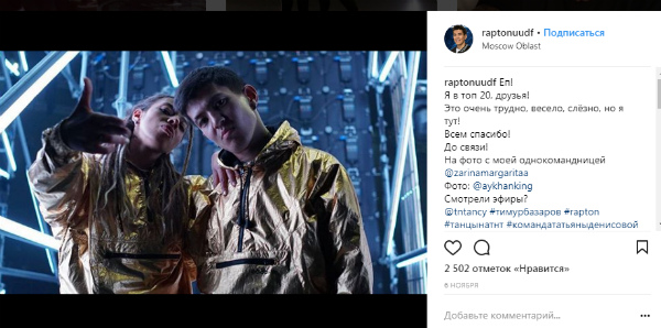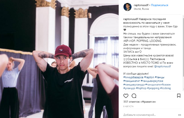 Открытием же года можно назвать второго участника шоу «Танцы» на ТНТ из Бурятии – Тимура Базарова. 22-летний выходец из посёлка Саган-Нур Мухоршибирского района прошёл отборочный тур проекта. Но, к сожалению, молодой человек, пройдя несколько этапов, в прошлом месяце покинул телешоу.