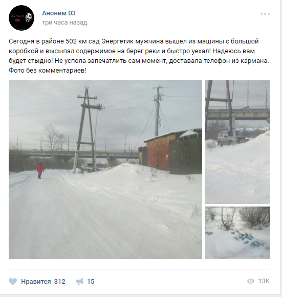 - Сегодня в районе 502 км сад Энергетик мужчина вышел из машины с большой коробкой и высыпал содержимое на берег реки и быстро уехал! Надеюсь, вам будет стыдно! Не успела запечатлеть сам момент, доставала телефон из кармана, - написала в «Анониме 03» возмущённая улан-удэнка.