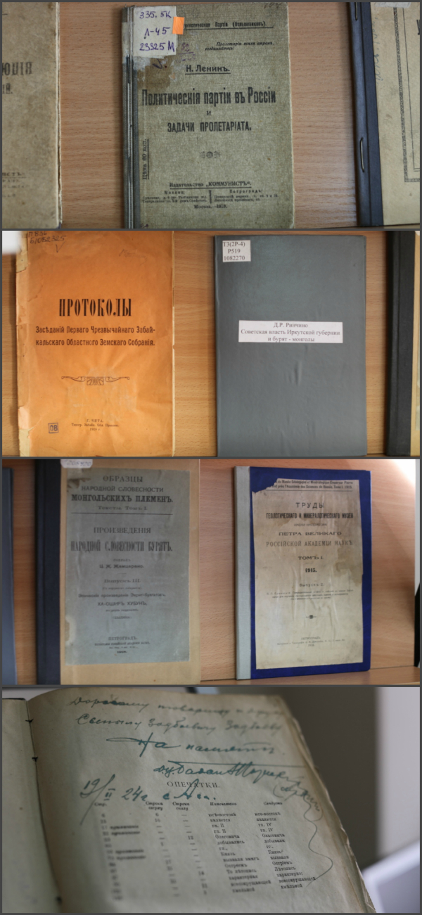 Что обсуждали противники Советской власти на своих заседаниях, можно узнать из «Протоколов Заседаний Первого Чрезвычайного Забайкальского Областного Земского Собрания», прошедшего в феврале 1918 года в Чите. Также из краеведческих изданий, на выставке можно просмотреть «Советская власть Иркутской губернии и бурят-монголы» выдающегося государственного и военного деятеля Ринчино, основные главы данной книги были изложены в виде доклада на общенациональном съезде бурят-монгол в Верхнеудинске 1917 года.