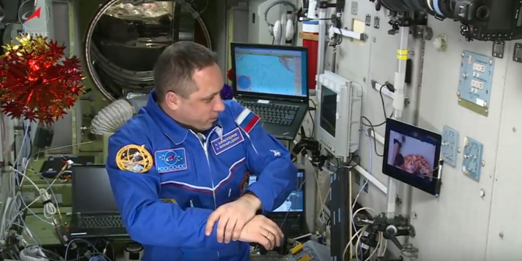 Короткий ролик был снят в космосе ещё в новогодние праздники, но только сейчас его доставила вернувшаяся на Землю 54-я экспедиция.