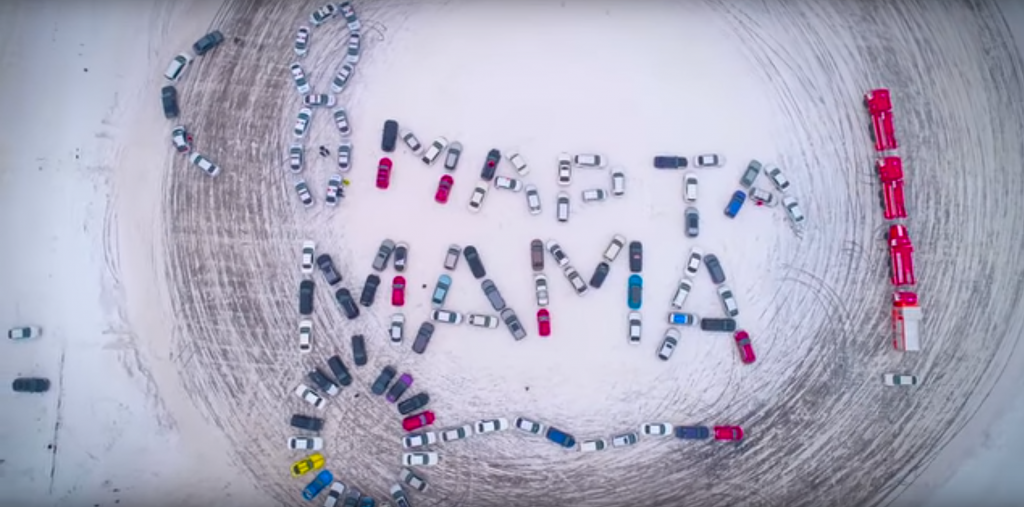 Флешмоб к Международному женскому дню прошёл в Иркутске у Академического моста. Более 100 автомобилей выстроились в надпись «С 8 марта, мама!»