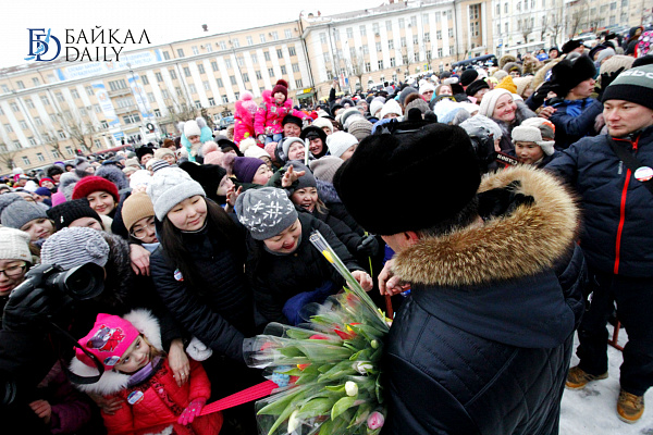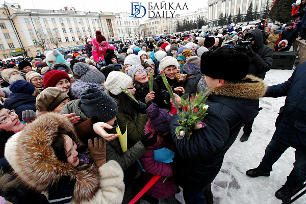 После он также лично раздал тюльпаны девушкам и женщинам из числа зрителей – сначала со сцены, а после спустился на землю. К главе тут же ринулось большое количество желающих получить цветок. Алексей Цыденов также фотографировался с присутствующими и говорил дамам поздравления.