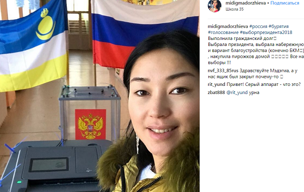 - Проголосовали с родителями за президента! Я ещё получила паспорт болельщика! – написала Доржиева в «Фейсбуке».