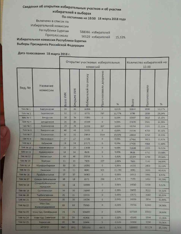 11.05. БD. А вот и первые результаты явки, по данным на 10.50 утра. Проголосовали уже 15,3% избирателей (90,1 тысяча человек). И это на самом деле результат впечатляющий. В одном только Окинском районе явка уже 40%!
