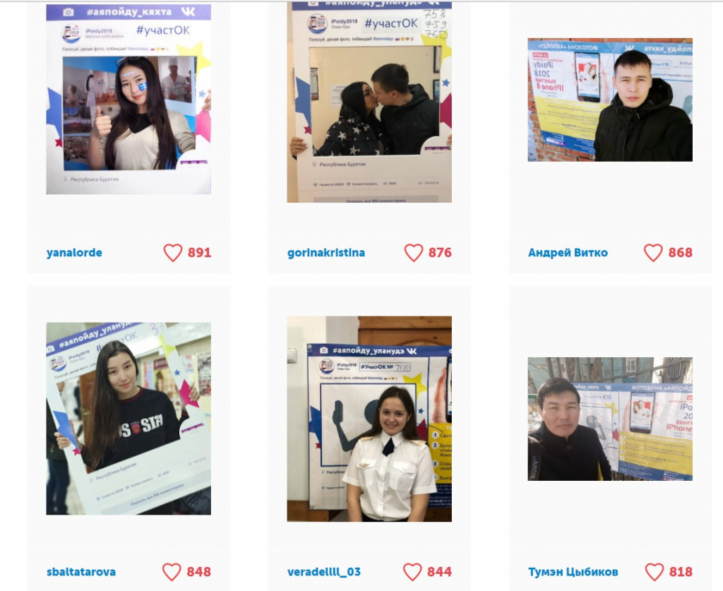 В Бурятии подводятся итоги фотоконкурсов «АЯПОЙДУ» и «Большой компанией на выборы». Напомним, для участия в конкурсе нужно было прийти на избирательные участки 18 марта, в день выборов президента России, сделать селфи в специальных фоторамках и разместить снимок «Вконтакте» или Instagram с хэштегом #аяпойду. Главные призы - iPhone 8 и iPhone 7.