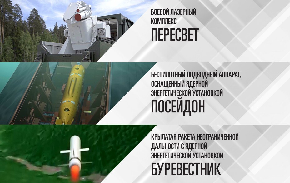 Боевому лазерному комплексу присвоено название «Пересвет», беспилотному подводному аппарату с ядерной энергетической установкой - «Посейдон», ядерной крылатой ракете неограниченной дальности - «Буревестник», сообщают «Известия».