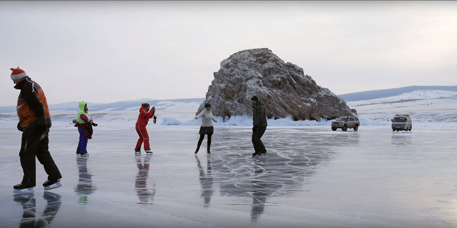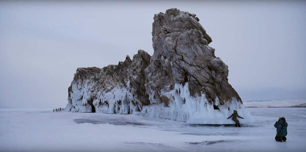 Добравшись до места, путешественники смело ходят по льду Байкала и даже ездят по нему на автомобилях. С помощью смартфонов и фотоаппаратов они фотографируют кристально-прозрачный лёд и даже катаются по нему лёжа на куртках.