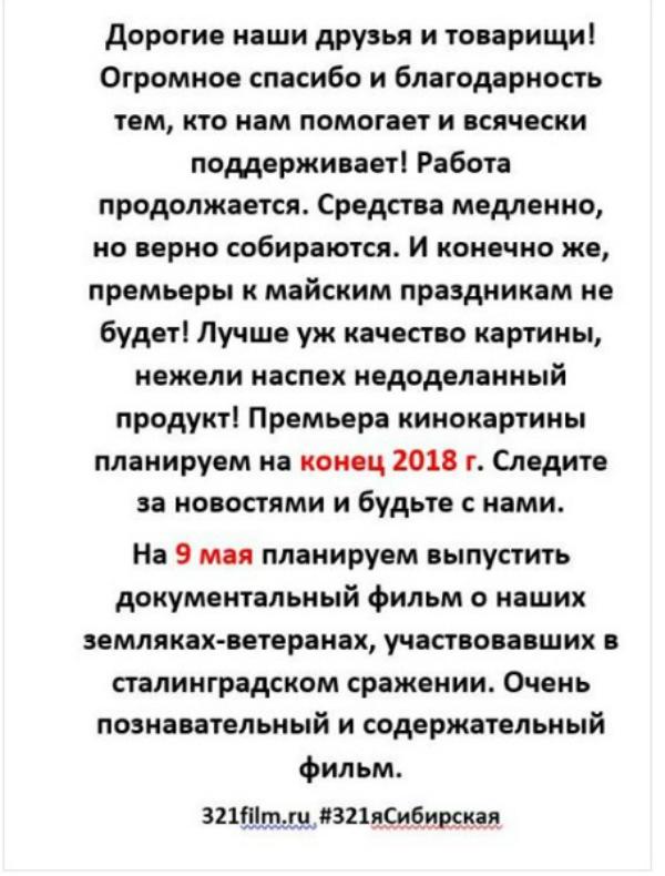 - Дорогие наши друзья и товарищи! Огромное спасибо и благодарность тем, кто нам помогает и всячески поддерживает! Работа продолжается. Средства медленно, но верно собираются. И конечно же, премьеры к майским праздникам не будет! Лучше уже качество картины, нежели недоделанный продукт, - написал он.