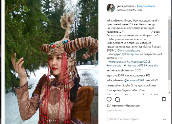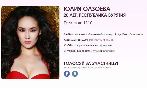 Как сообщал «Байкал-Daily», 20-летняя улан-удэнка Юлия Олзоева борется за корону «Мисс Россия-2018». Юлия студентка, учится на ювелира. Представительница Бурятии уже вошла в число 50 красавиц страны, а сейчас участвует в интернет-голосовании, по итогам которого будут топ-20 девушек. Проголосовать за Юлию Олзоеву можно по ссылке http://www.missrussia.ru/contest
