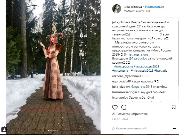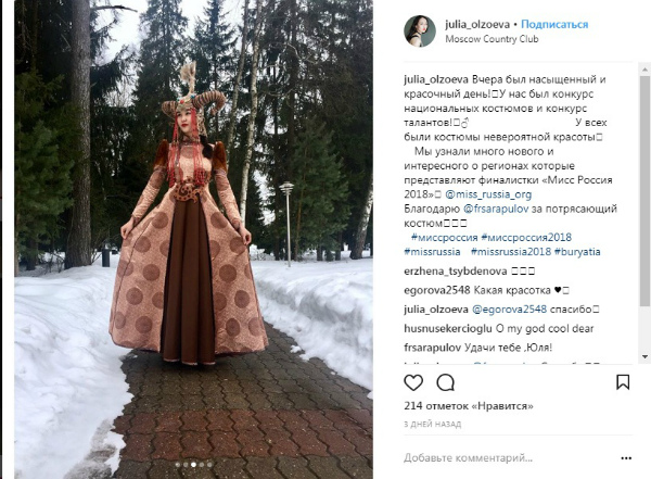 - Вчера был насыщенный и красочный день! У нас был конкурс национальных костюмов и конкурс талантов! У всех были костюмы невероятной красоты. Мы узнали много нового и интересного о регионах, которые представляют финалистки «Мисс Россия 2018», - пишет Юлия в соцсетях.